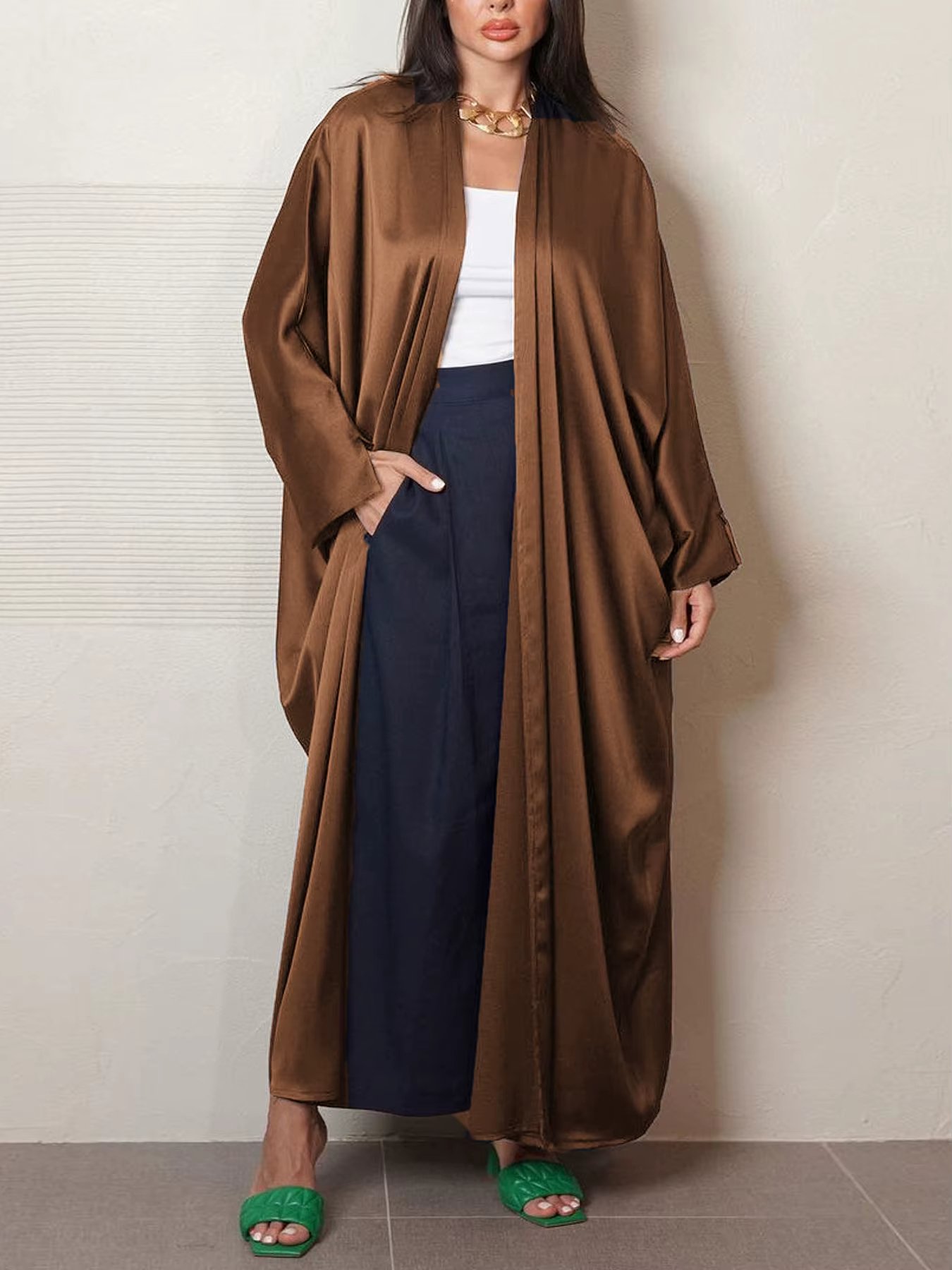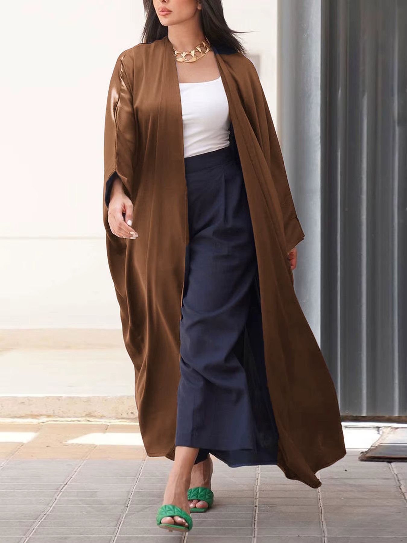 العباءة مفتوحة دون حزام لكنها تتناسب مع أي إكسسوار لتثبيت الطلة